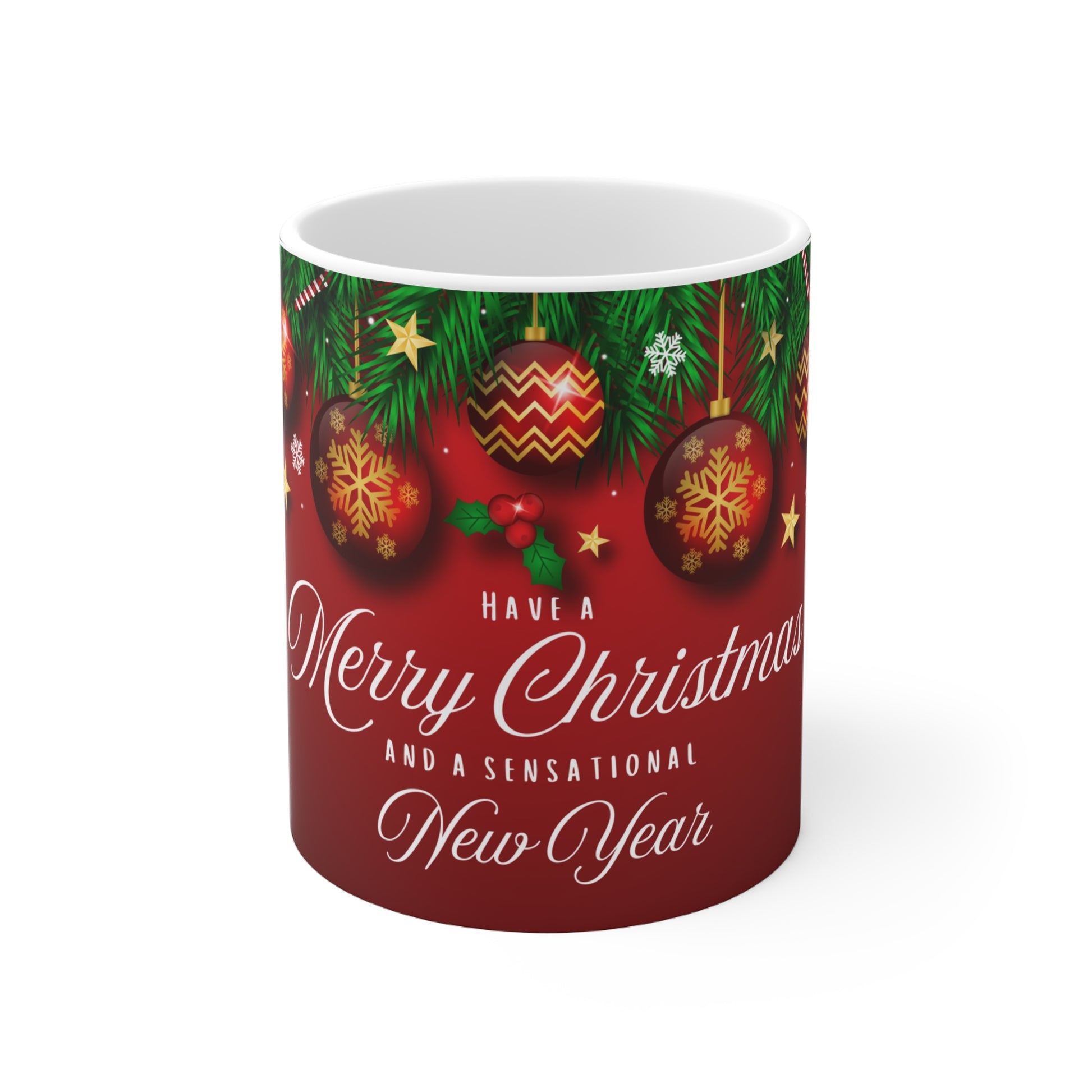 Warmth in your hands and a little holiday sparkle. This ceramic coffee cup wraps a classic red field with lush pine boughs and golden ornaments, the script whispering ‘Merry Christmas and a sensational New Year.’ It’s made to bring cozy mornings, slow sips, and seasonal cheer to everyday routines—whether set on a kitchen counter, beside a stack of holiday cards, or carried from the stove to the living room while the tree lights glow. The glossy white ceramic brightens the print’s reds and golds, and the comfortable C-shaped handle keeps your grip steady through multiple refills. Bright, durable color and microwave- and dishwasher-safe construction mean this mug lives on through many December mornings and New Year’s toasts.